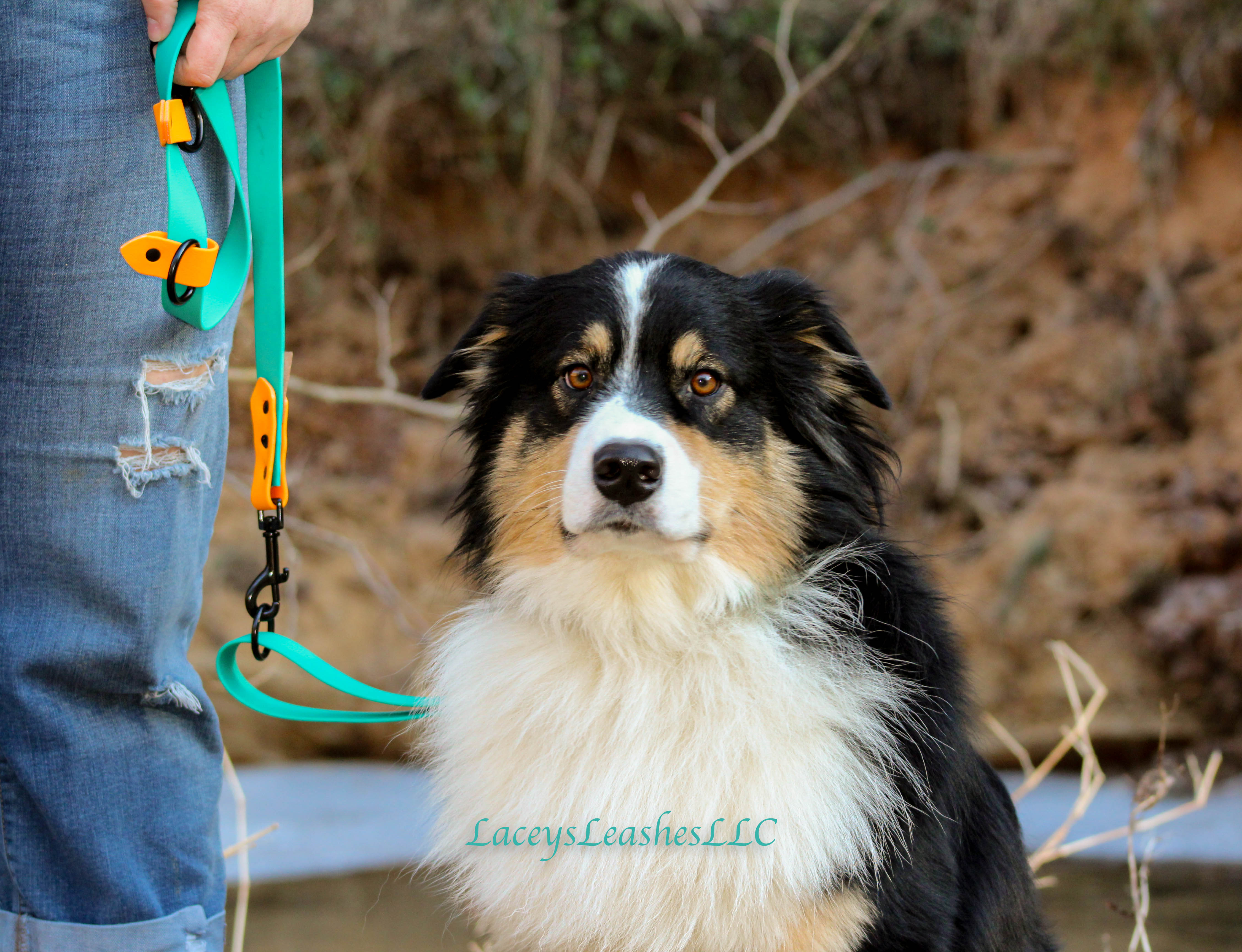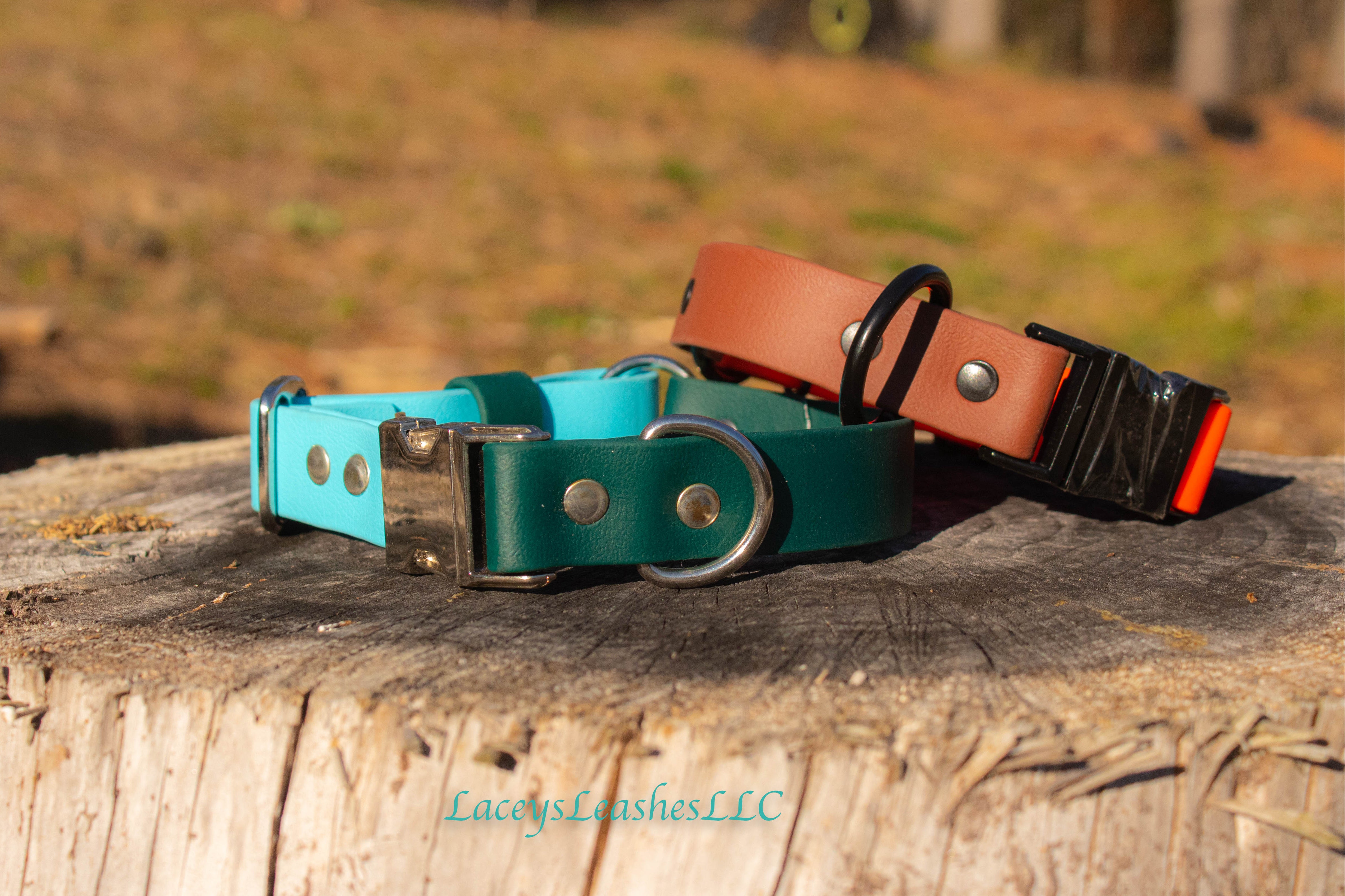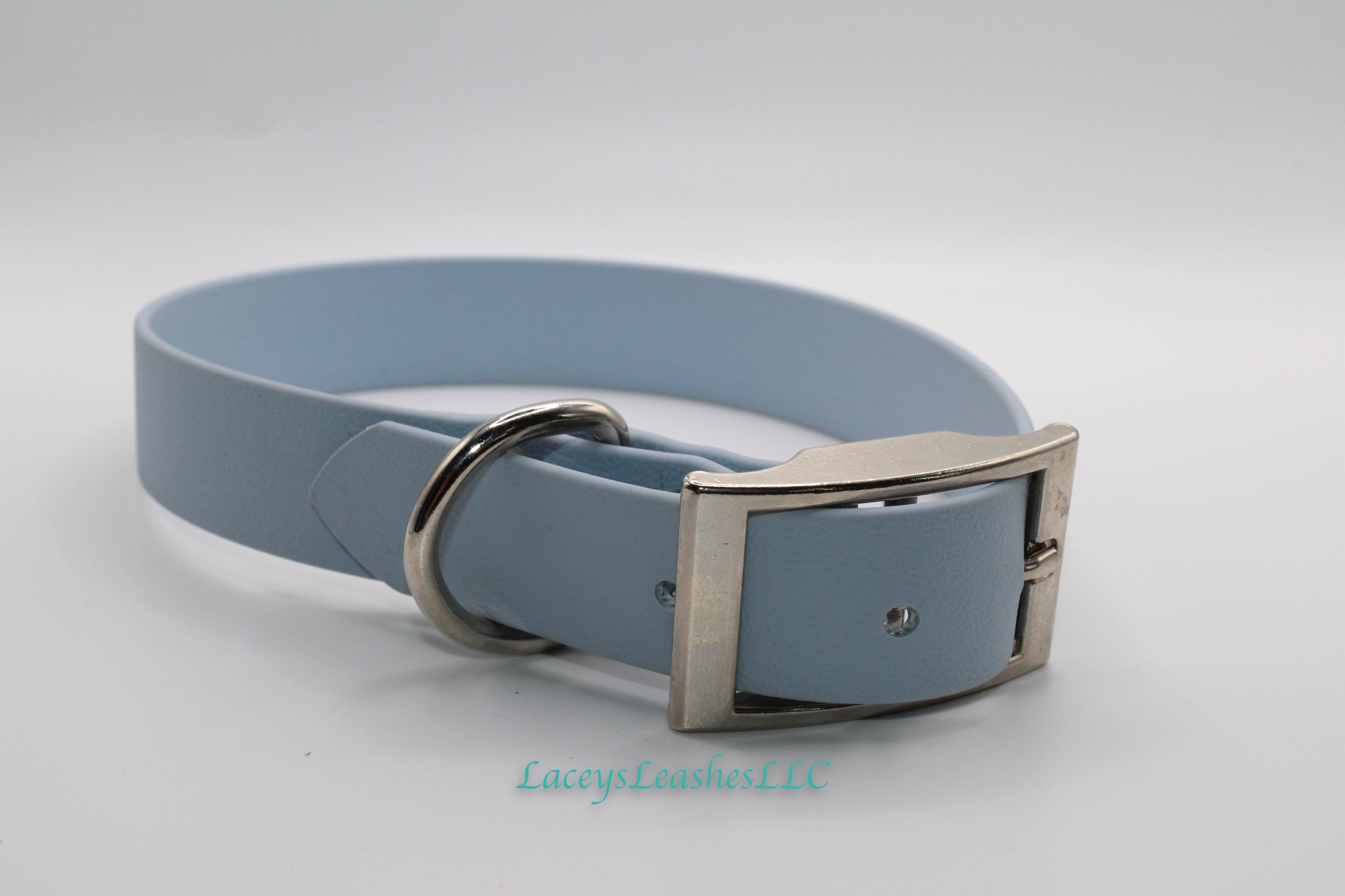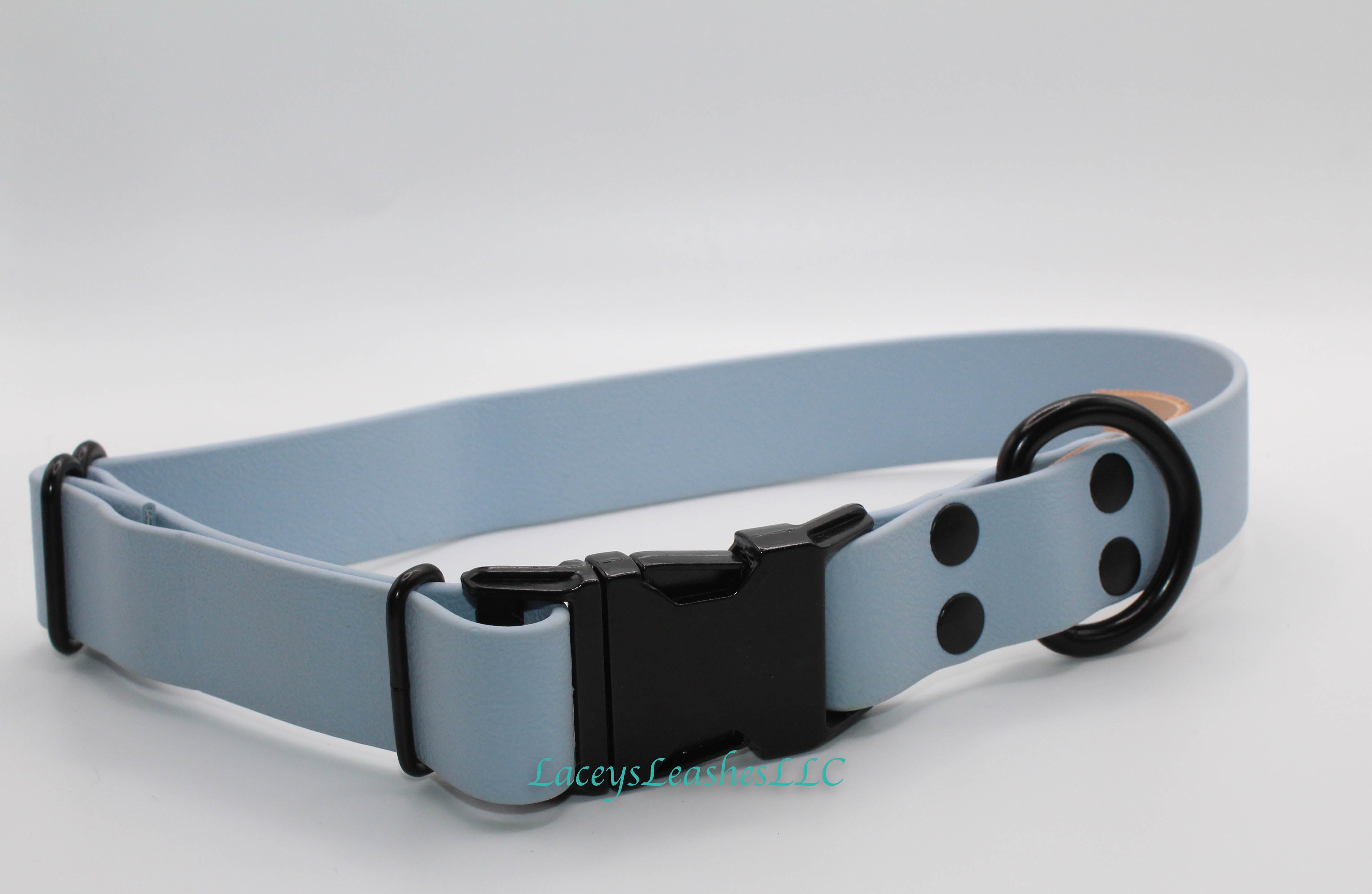 Biothane is a vegan leather that is very durable, stink-proof, mold-proof, and waterproof. It is a polyester webbing that is powder coated with a PVC coating on the outside. This product is used by many canine handlers and pet parents alike! It is a more hygienic material than its fabric and leather counterparts and it will last forever. It can come in multiple colors and we also offer patterned biothane in our limited edition sets from time to time. This product is also safe for pets with allergies as it will not hold onto allergens when washed.